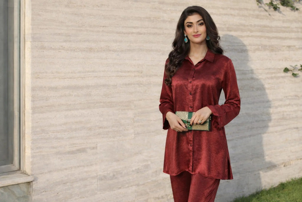 Winter co ord sets in Pakistan are made using warmer fabrics like velvet, wool blends, and thicker linens. They provide both warmth and style. These sets are often paired with shawls or long coats for a complete winter look.