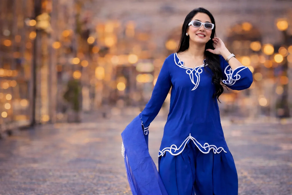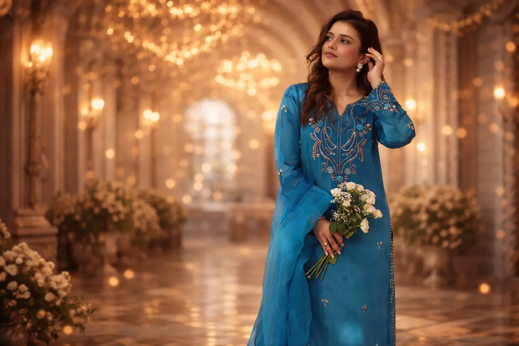 This year, less is more. Designers are moving away from heavy embellishments and focusing on subtle embroidery and fine detailing. Simple threadwork, tone-on-tone textures, and clean silhouettes are trending. These pieces are versatile enough for brunches, formal dinners, or small celebrations.