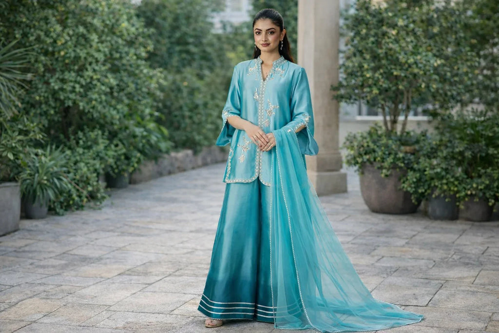 This year, less is more. Designers are moving away from heavy embellishments and focusing on subtle embroidery and fine detailing. Simple threadwork, tone-on-tone textures, and clean silhouettes are trending. These pieces are versatile enough for brunches, formal dinners, or small celebrations.